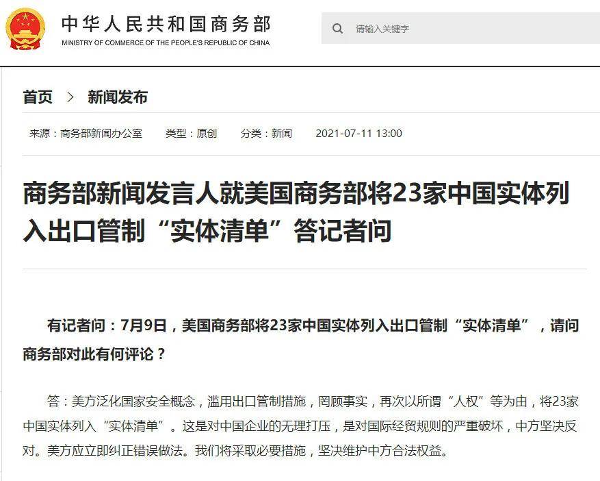7月9日,商務(wù)部新聞發(fā)言人就美國(guó)商務(wù)部將23家中國(guó)實(shí)體列入出口管制“實(shí)體清單”答記者問(wèn):美方泛化國(guó)家安全概念,濫用出口管制措施,罔顧事實(shí),再次以所謂“人權(quán)”等為由,將23家中國(guó)實(shí)體列入“實(shí)體清單”。這是對(duì)中國(guó)企業(yè)的無(wú)理打壓,是對(duì)國(guó)際經(jīng)貿(mào)規(guī)則的嚴(yán)重破壞,中方堅(jiān)決反對(duì)。美方應(yīng)立即糾正錯(cuò)誤做法。我們將采取必要措施,堅(jiān)決維護(hù)中方合法權(quán)益。